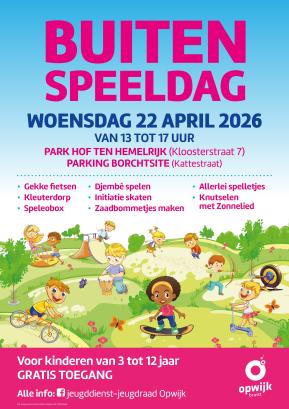 Dit jaar vindt de Buitenspeeldag plaats op woensdag 22 april 2026 van 13 tot 17 uur in het park van Hof ten Hemelrijk (Kloosterstraat 7) en op een deel van de parking van Borchtsite (Kattestraat).