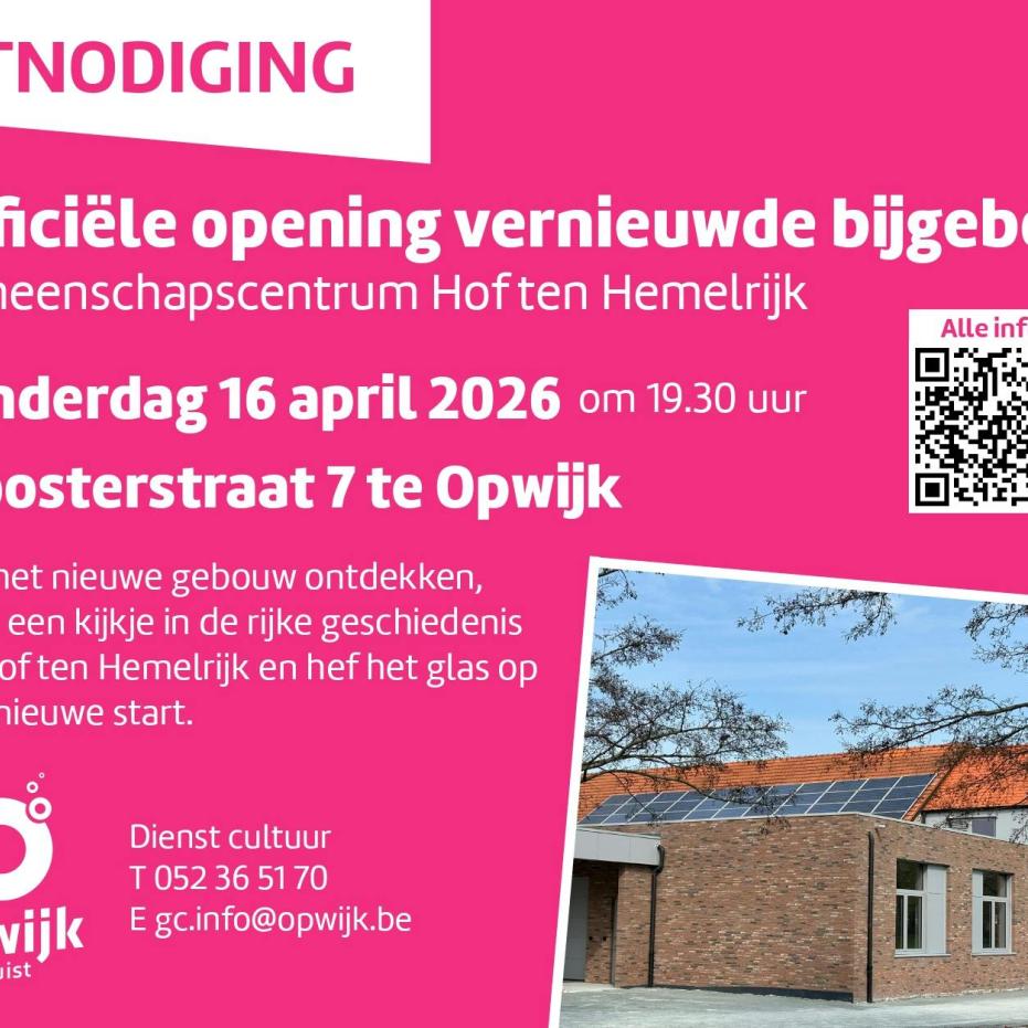 Lokaal bestuur Opwijk nodigt je van harte uit voor de officiële opening van het nieuwe bijgebouw van GC Hof ten Hemelrijk op donderdag 16 april 2026 vanaf 19u30.