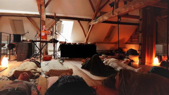 Je ligt neer, je ogen gesloten. Wat volgt is een reis waarin je mag zakken, vertragen en loslaten. Ritme wordt ruimte. Klank wordt rust. Alles is in beweging, alles is in balans. Inademen. Uitademen. En weer opnieuw.
