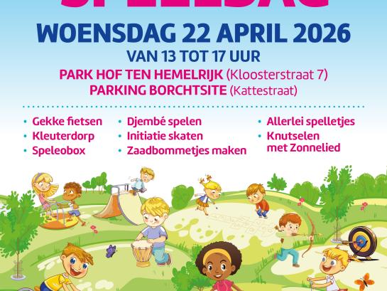 Dit jaar vindt de Buitenspeeldag plaats op woensdag 22 april 2026 van 13 tot 17 uur in het park van Hof ten Hemelrijk (Kloosterstraat 7) en op een deel van de parking van Borchtsite (Kattestraat).Geplande werken De Watergroep Steenweg op Merchtem